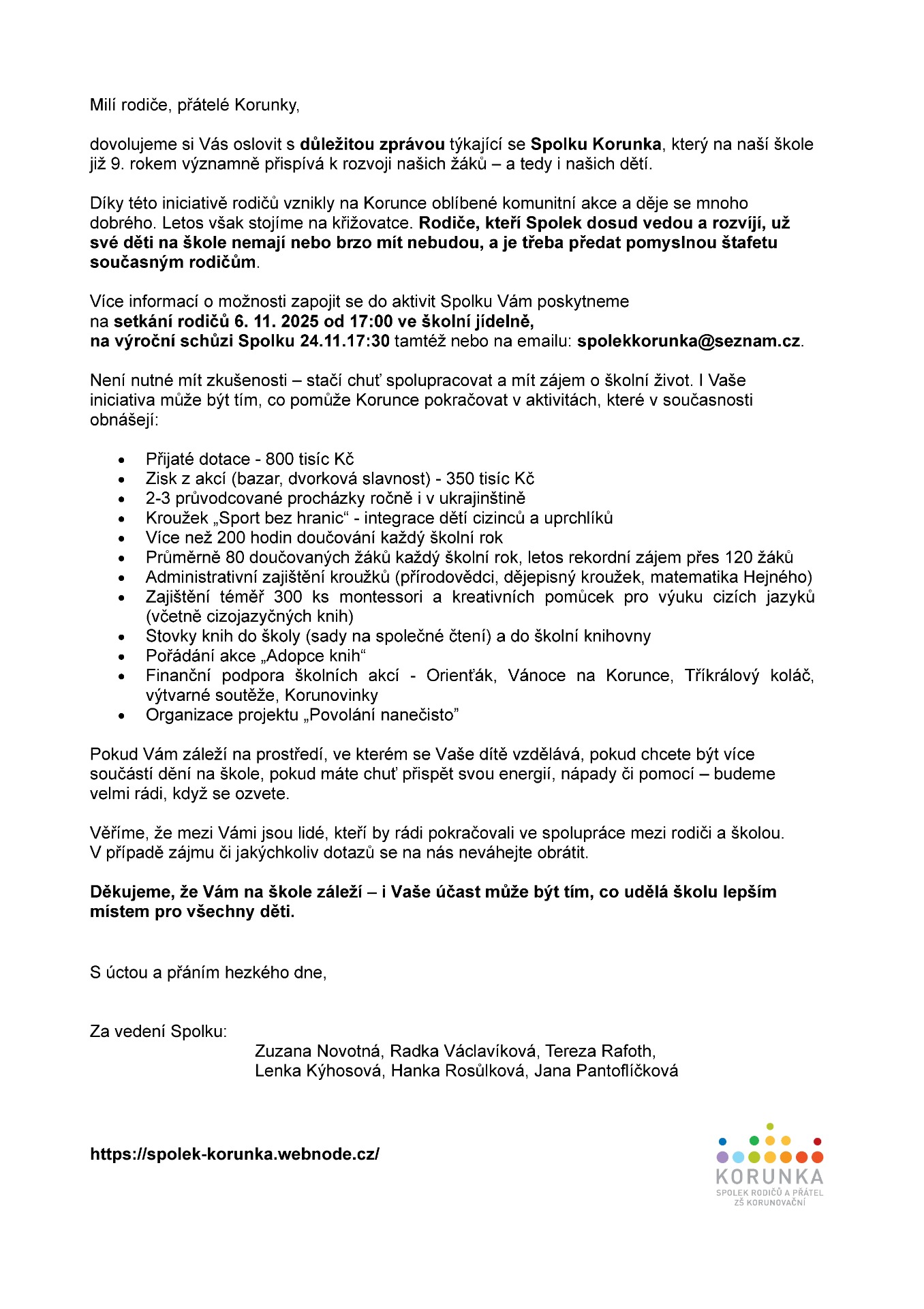 Milí rodiče, členové i nečlenové spolku Korunka,