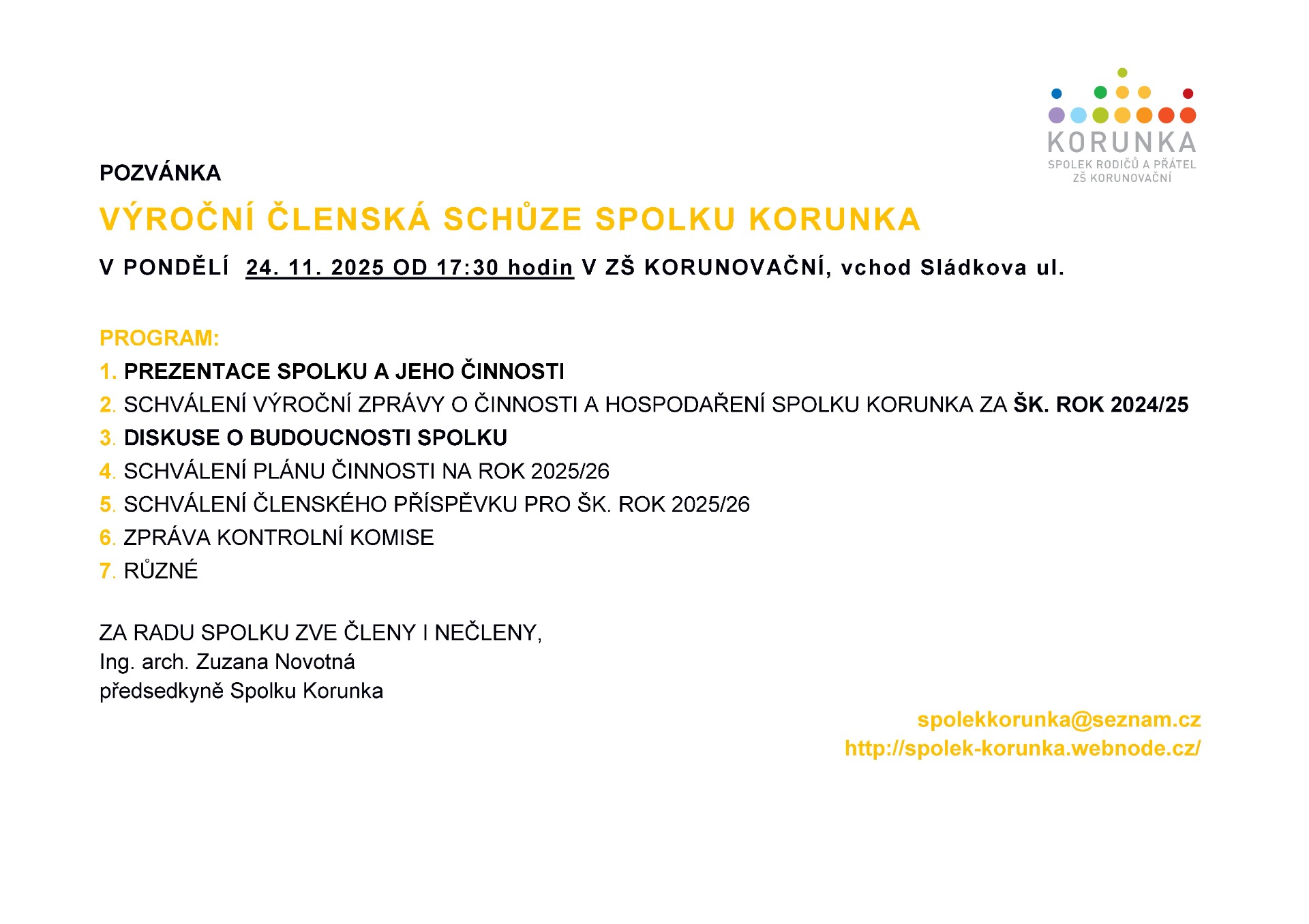 přijďte se seznámit s aktivitami a činností celoškolního rodičovského spolku Korunka ve středu 20. listopadu od 17:30 hod v učebně fyziky. Čeká vás vstřícná atmosféra s občerstvením a svižná prezentace ve stylu Pecha Kucha Night (krátké komentáře promítaných fotek). Na setkání bude navazovat výroční členská schůze spolku, jejíž program najdete v příloze. Těšíme se na vás!