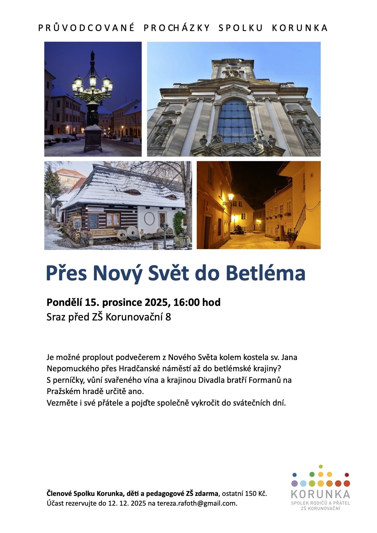V roce 2025 se nám díky podpoře MČ Praha 7 podařilo uskutečnit 3 průvodcované procházky, které k naší radosti spojovala hojná návštěvnost.Procházky připravila, organizovala a vedla průvodkyně Tereza Rafoth, v případě procházky zakončené v Národní galerii ve spolupráci s lektorkou Monikou Švec Sybolovou.Na procházkách se nejčastěji setkávali pedagogové a rodiče, zároveň se však přidalo vždy několik dětí. Každá procházka byla zakončena neformálním posezením, během nějž účastníci sdíleli informace o školních aktivitách i projektech Spolku Korunka. Pro účastníky jsme vždy zajistili audiosady, díky nimž byl výklad dobře srozumitelný i při větším počtu lidí a za náročného počasí.Také letos se potvrdilo, proč jsme se do tohoto formátu akcí pustili: procházky měly živou, přátelskou atmosféru s vzdělávacím přesahem. Tento způsob setkávání propojený se společným poznáváním, mezigeneračním učením a propojováním učitelské a rodičovské komunity považujeme dlouhodobě za velmi přínosný a rádi bychom v něm pokračovali i v příštím roce.